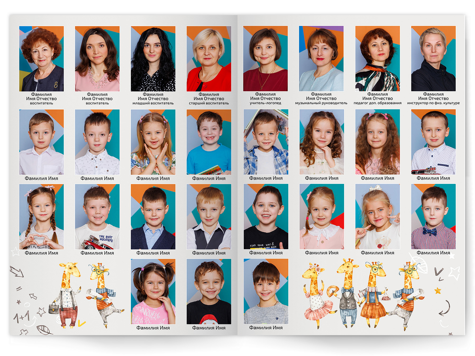 • Портреты всех детей и воспитателей на развороте или странице